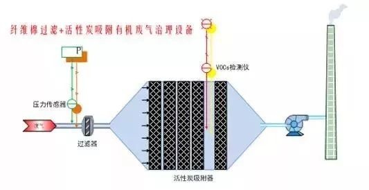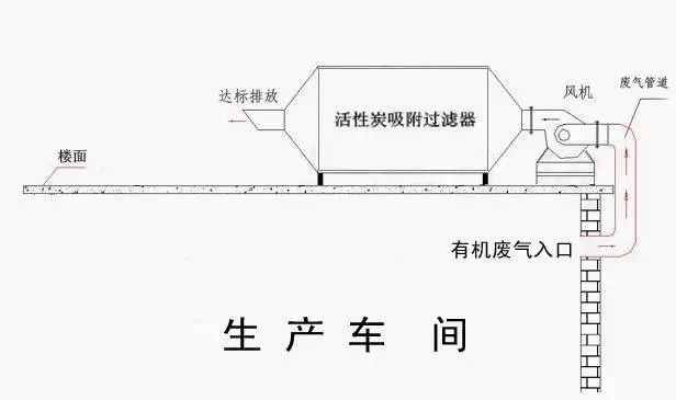 車間有機(jī)廢氣通過吸氣罩收集,在排風(fēng)機(jī)作用下,經(jīng)過管道輸送進(jìn)入干式過濾器,再進(jìn)入活性炭吸附裝置,有機(jī)污染物被活性炭吸附,凈化后的氣體經(jīng)風(fēng)機(jī)增壓后達(dá)標(biāo)排放。活性炭吸附飽和后,請專業(yè)廠家再生后回用。